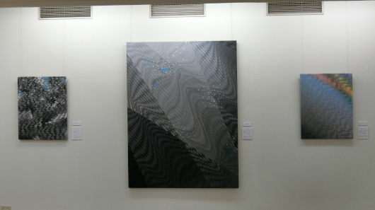 先回の個展で、「現代の絣」と評してくださった方がいました。今も続けている技法を始めて15,16年目の頃です。 この技法は、同じサイズに染めた2枚の布を、それぞれテープ状にカッティングし、織り込んで、一枚の布に仕上げています。 また、「音楽を感じる」と感想を頂き、意識外だった音楽からどのような表現ができるのか、試行錯誤しながら十余年、制作を続けてきました。 布が織りなす曲線は、音楽の激しさ、穏やかさであり、一こま一こまは、メロディーであり、リズムです。
