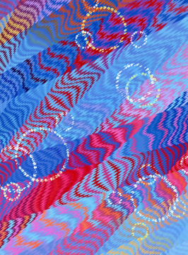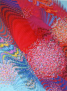 先回の個展で、「現代の絣」と評してくださった方がいました。今も続けている技法を始めて15,16年目の頃です。 この技法は、同じサイズに染めた2枚の布を、それぞれテープ状にカッティングし、織り込んで、一枚の布に仕上げています。 また、「音楽を感じる」と感想を頂き、意識外だった音楽からどのような表現ができるのか、試行錯誤しながら十余年、制作を続けてきました。 布が織りなす曲線は、音楽の激しさ、穏やかさであり、一こま一こまは、メロディーであり、リズムです。